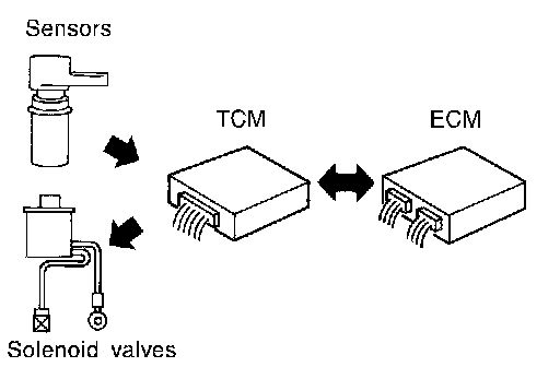 The TCM also communicates with the ECM by means of a signal sent from sensing elements used with the OBD-related parts of the A/T system for malfunction-diagnostic purposes. The TCM is capable of diagnosing malfunctioning parts while the ECM can store malfunctions in its memory.