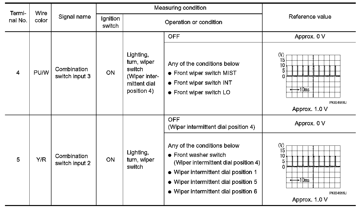 - Turn wiper dial position to 4 except when checking waveform or voltage of wiper dial position. Wiper dial position can be confirmed on CONSULT-II. Refer to LT-119, "DATA MONITOR". Scan Tool Testing and Procedures