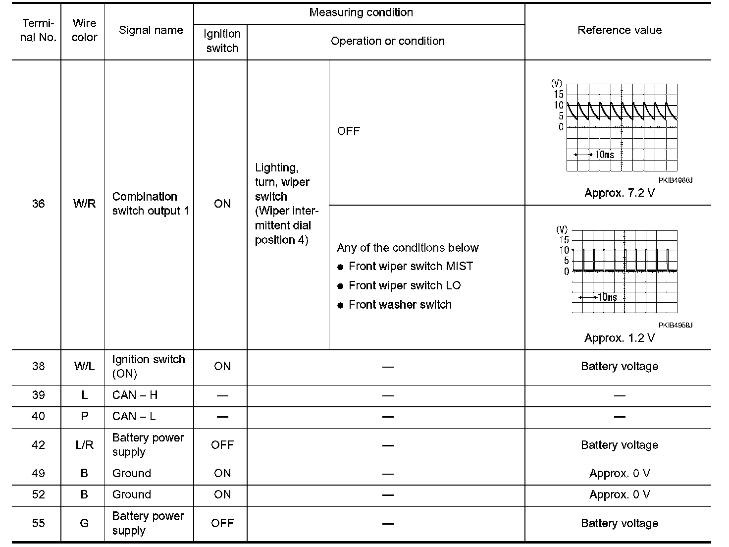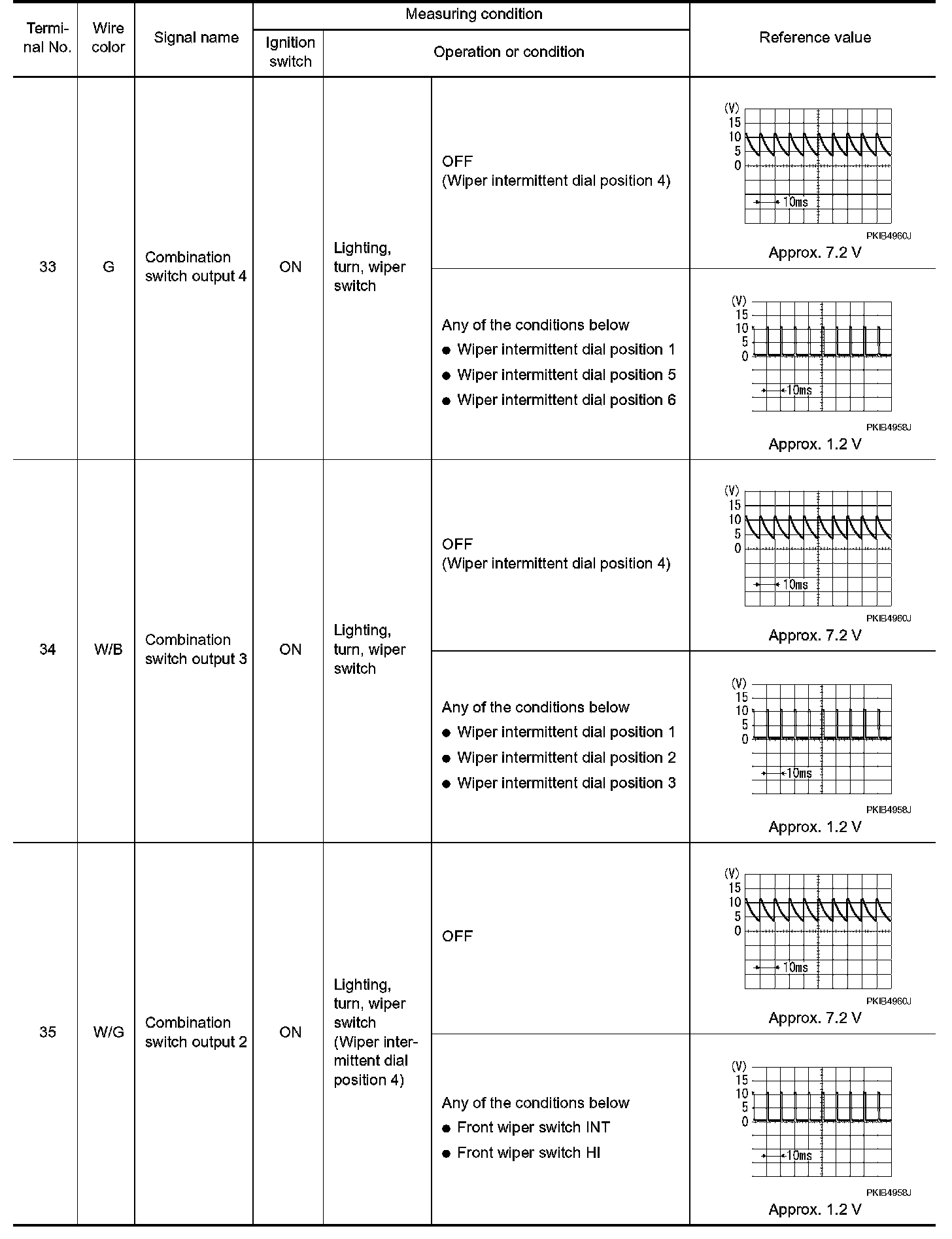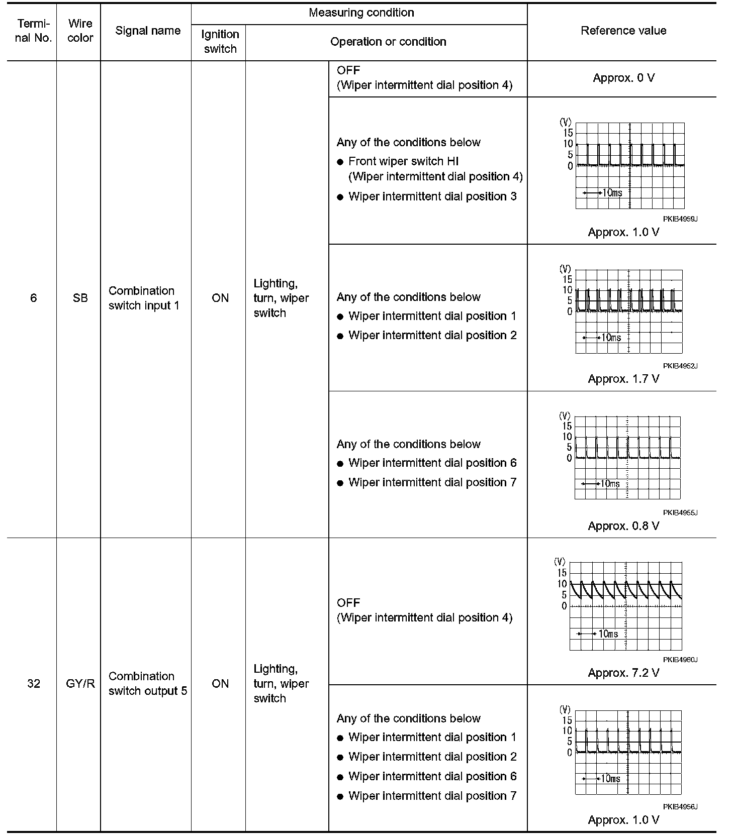 - Check combination switch system terminal waveform under the loaded condition with lighting switch, turn signal switch and wiper switch OFF not to be fluctuated by overloaded.