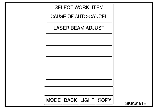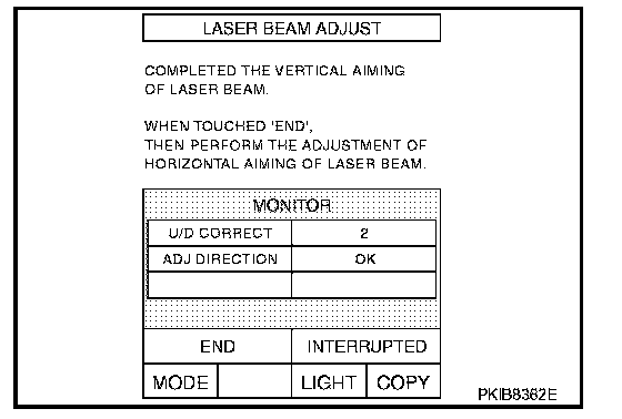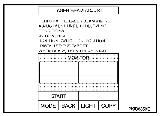 CAUTION: If the adjustment screen does not appear on the CONSULT-II screen in 10 seconds. After touching "LASER BEAM ADJUST" screen, the following causes may be considered: