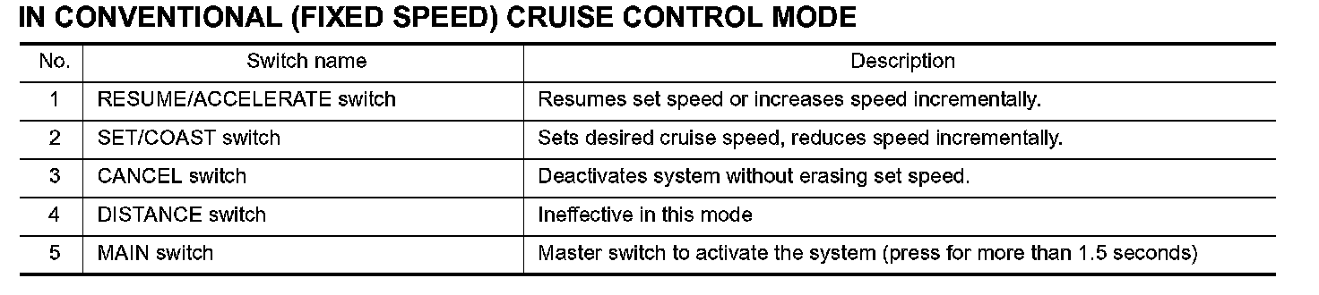 IN CONVENTIONAL (FIXED SPEED) CRUISE CONTROL MODE