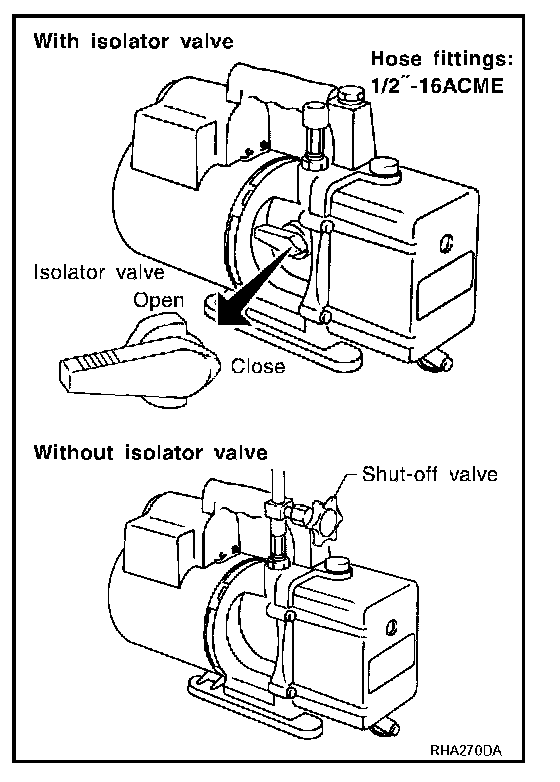 The lubricant contained inside the vacuum pump is not compatible with the specified lubricant for HFC-134a (R-134a) A/C systems. The vent side of the vacuum pump is exposed to atmospheric pressure. So the vacuum pump lubricant may migrate out of the pump into the service hose. This is possible when the pump is switched off after evacuation (vacuuming) and hose is connected to it.