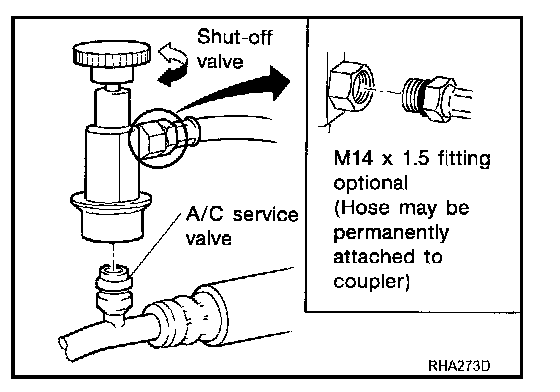 Be certain that the service hoses display the markings described (colored hose with black stripe). All hoses must include positive shutoff devices (either manual or automatic) near the end of the hoses opposite the manifold gauge.