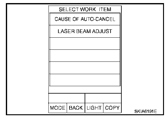 CAUTION: If the adjustment screen does not appear on CONSULT-II 10 sec. after touching "LASER BEAM ADJUST" screen, the following causes may be considered: