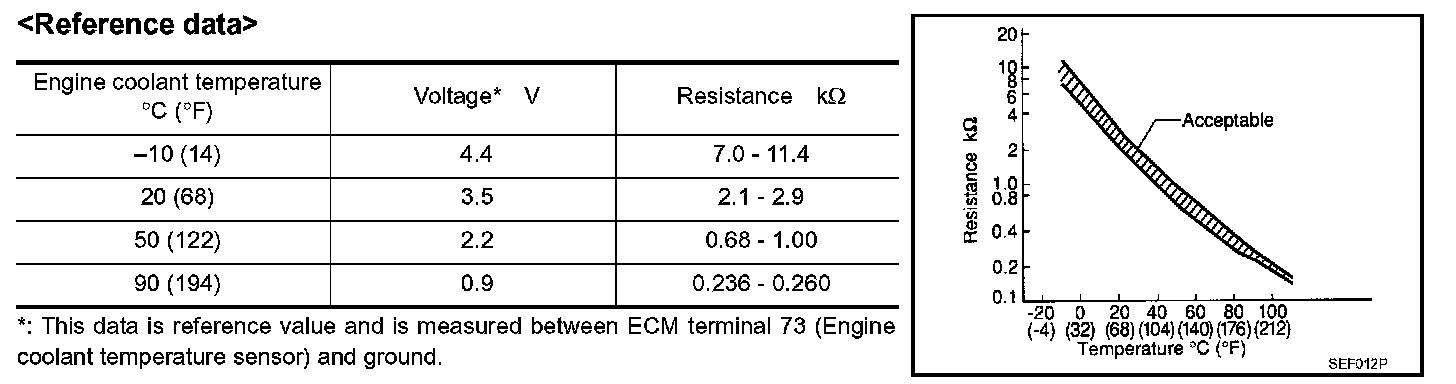 The engine coolant temperature sensor is used to detect the engine coolant temperature. The sensor modifies a voltage signal from the ECM. The modified signal returns to the ECM as the engine coolant temperature input. The sensor uses a thermistor which is sensitive to the change in temperature. The electrical resistance of the thermistor decreases as temperature increases.