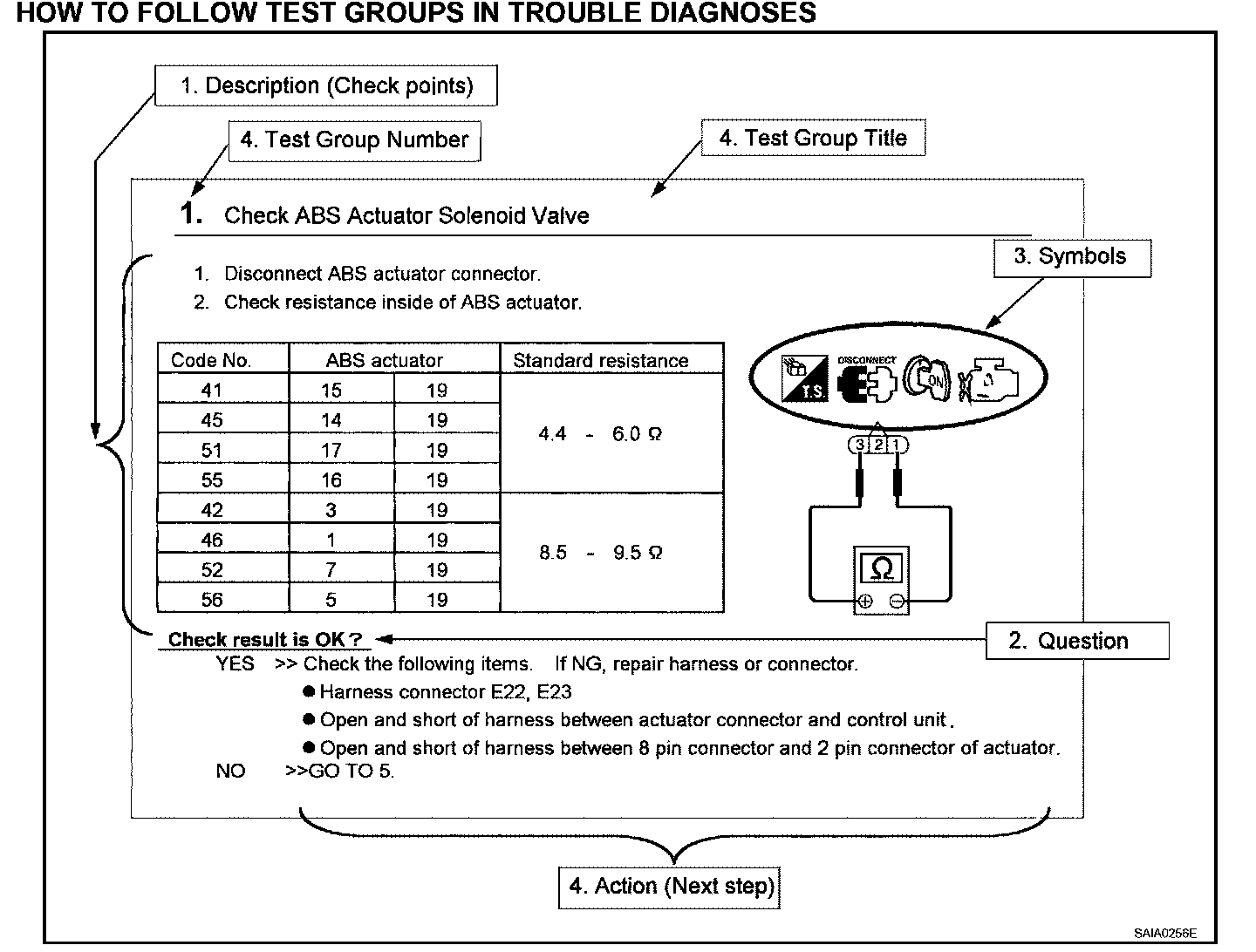 Next action for each test group is indicated based on result of each question. Test group number is shown in the left upper portion of each test group.