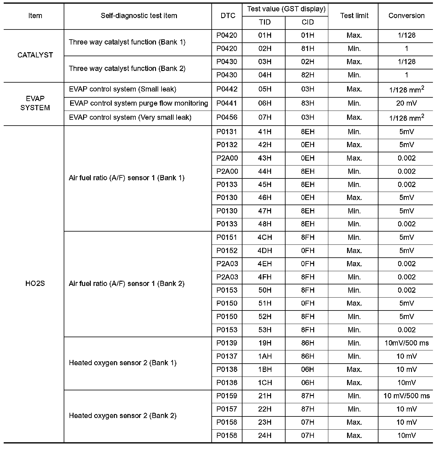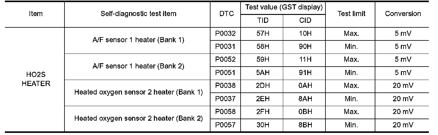 The test value is a parameter used to determine whether a system/circuit diagnostic test is OK or NG while being monitored by the ECM during self-diagnosis. The test limit is a reference value which is specified as the maximum or minimum value and is compared with the test value being monitored.