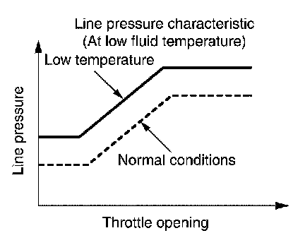 When the A/T fluid temperature drops below the prescribed temperature, in order to speed up the action of each friction element, the line pressure is set higher than the normal line pressure characteristic.