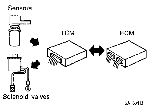 The TCM also communicates with the ECM by means of a signal sent from sensing elements used with the OBD-related parts of the A/T system for malfunction-diagnostic purposes. The TCM is capable of diagnosing malfunctioning parts while the ECM can store malfunctions in its memory