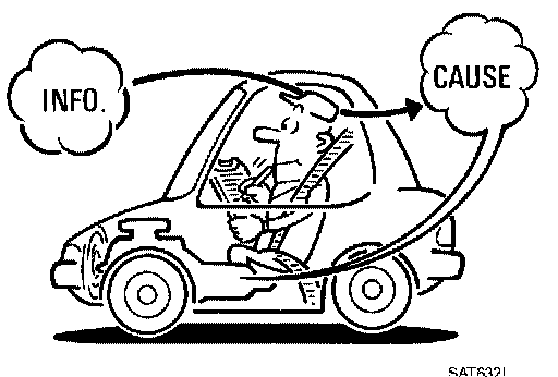 Before undertaking actual checks, take a few minutes to talk with a customer who approaches with a driveability complaint. The customer can supply good information about such errors, especially intermittent ones. Find out what symptoms are present and under what conditions they occur. A Diagnostic Worksheet as shown on the example (Refer to AT-46) should be used. Diagnostic Worksheet