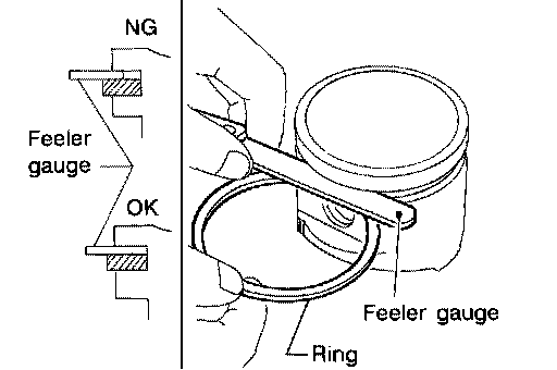 ^ If out of specification, replace piston ring. If the gap still exceeds the limit even with a new ring, re-bore the cylinder and use oversized piston and piston ring.