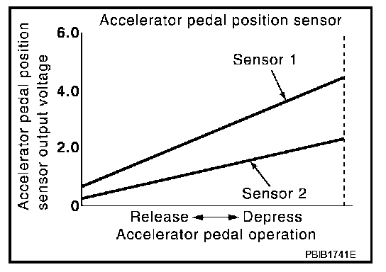 Accelerator pedal position sensor has two sensors. These sensors are a kind of potentiometers which transform the accelerator pedal position into output voltage, and emit the voltage signal to the ECM.