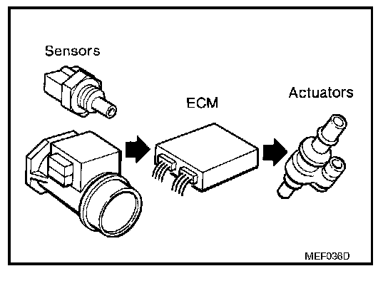The engine has an ECM to control major systems such as fuel control, ignition control, idle air control system, etc. The ECM accepts input signals from sensors and instantly drives actuators. It is essential that both input and output signals are proper and stable. At the same time, it is important that there are no malfunctions such as vacuum leaks, fouled spark plugs, or other malfunctions with the engine.