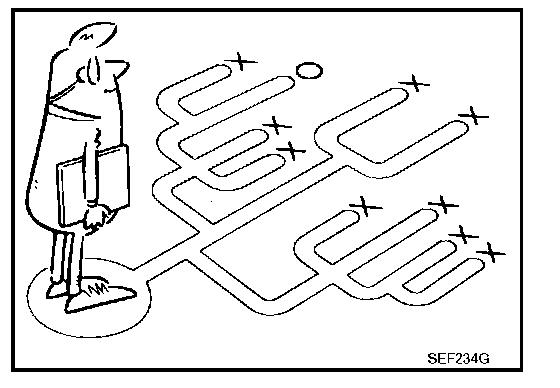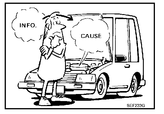 A visual check only may not find the cause of the incidents. A road test with CONSULT-II (or GST) or a circuit tester connected should be performed. Follow the WORK FLOW on EC-88, "WORK FLOW". Work Flow Before undertaking actual checks, take a few minutes to talk with a customer who approaches with a driveability complaint. The customer can supply good information about such incidents, especially intermittent ones. Find out what symptoms are present and under what conditions they occur. A DIAGNOSTIC WORKSHEET like the example on EC-91, "DIAGNOSTIC WORKSHEET" should be used. Start your diagnosis by looking for conventional malfunctions first. This will help troubleshoot driveability malfunctions on an electronically controlled engine vehicle. Diagnostic Worksheet