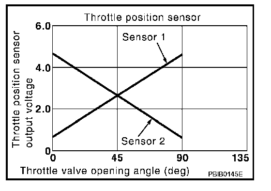 The throttle position sensor has two sensors. These sensors are a kind of potentiometers which transform the throttle valve position into output voltage, and emit the voltage signal to the ECM. In addition, these sensors detect the opening and closing speed of the throttle valve and feed the voltage signals to the ECM. The ECM judges the current opening angle of the throttle valve from these signals and the ECM controls the throttle control motor to make the throttle valve opening angle properly in response to driving condition.