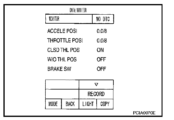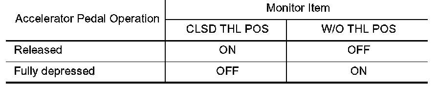 3. Depress accelerator pedal and read out the value of "CLSD THL POS" and "W/O THL POS".