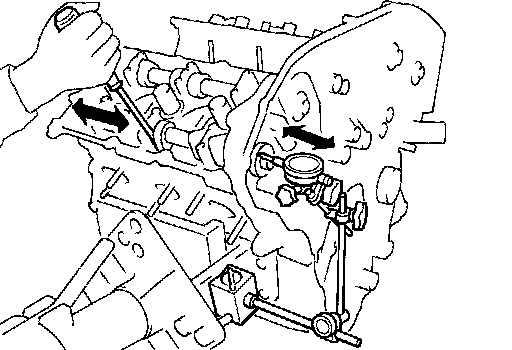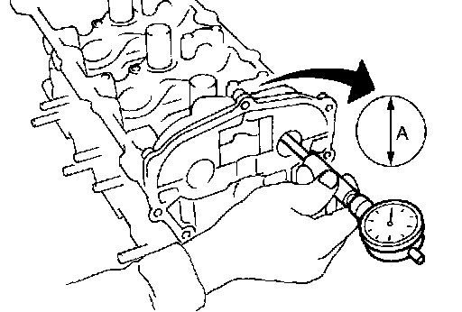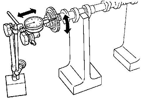 ^ Install a dial indicator in thrust direction on front end of camshaft. Measure the end play of a dial indicator when camshaft is moved forward/backward (in direction to axis).