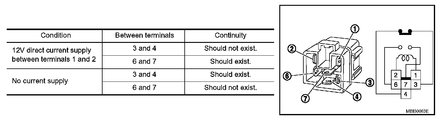 2. Check continuity between relay terminals 3 and 4, 6 and 7 under the given conditions.