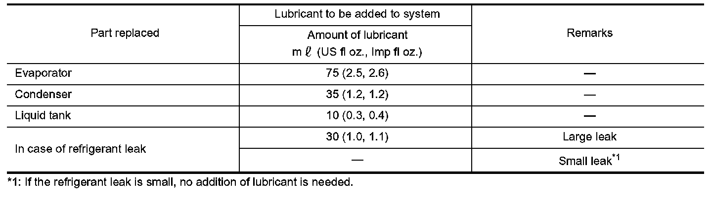 The lubricant in the compressor circulates through the system with the refrigerant. Add lubricant to compressor when replacing any component or after a large refrigerant leakage occurred. It is important to maintain the specified amount.
