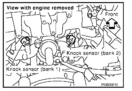 The knock sensor is attached to the cylinder block. It senses engine knocking using a piezoelectric element. A knocking vibration from the cylinder block is sensed as vibrational pressure. This pressure is converted into a voltage signal and sent to the ECM.
