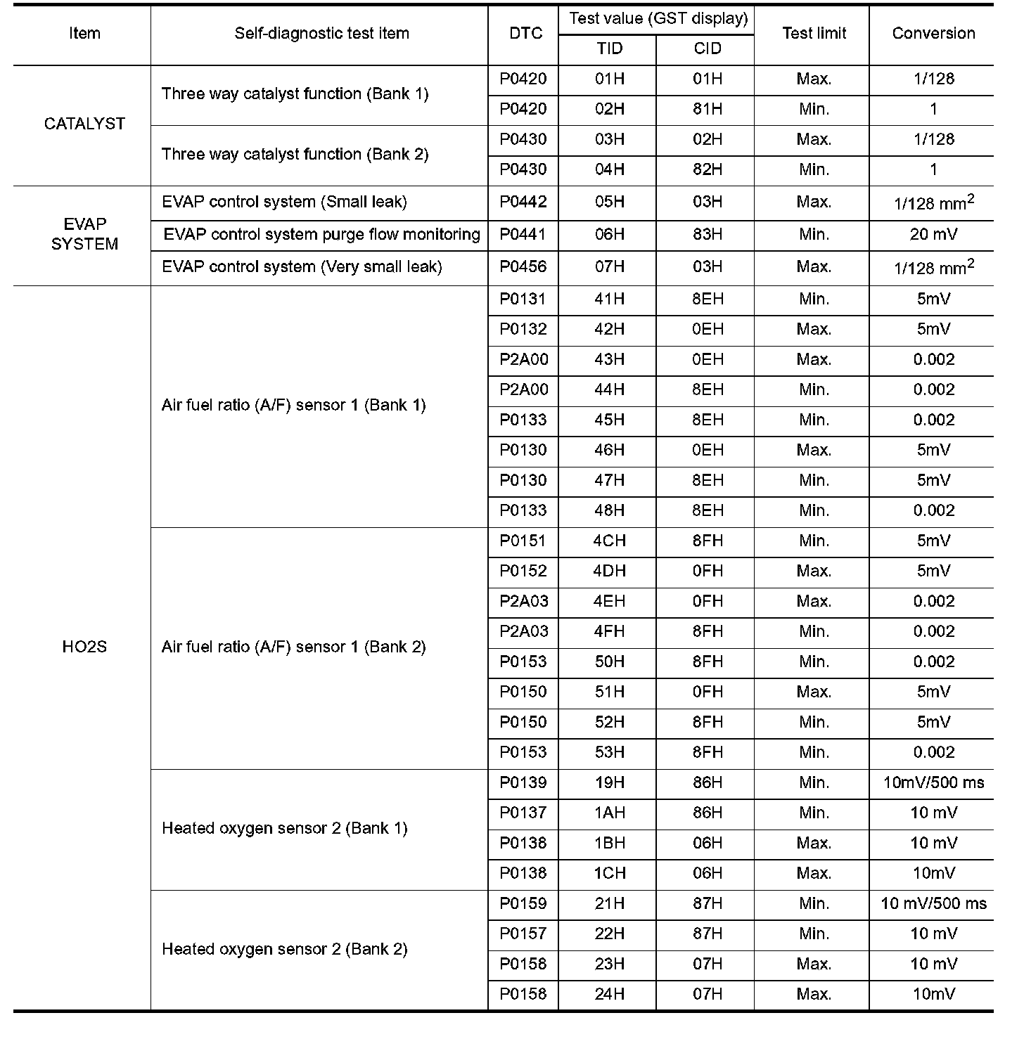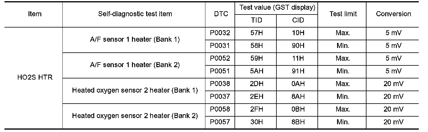 The test value is a parameter used to determine whether a system/circuit diagnostic test is OK or NG while being monitored by the ECM during self-diagnosis. The test limit is a reference value which is specified as the maximum or minimum value and is compared with the test value being monitored.