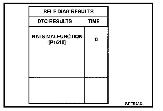 - If the security indicator lights up with the ignition switch in the ON position or "NATS MALFUNCTION" is displayed on "SELF-DIAG RESULTS" screen, perform self-diagnostic results mode with CONSULT-II using NATS program card. Refer to BL-205, "IVIS (INFINITI VEHICLE IMMOBILIZER SYSTEM-NATS)". IVIS (Infiniti Vehicle Immobilizer System-NATS)