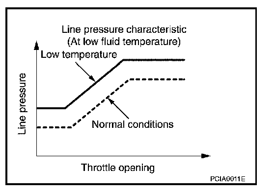 When the A/T fluid temperature drops below the prescribed temperature, in order to speed up the action of each friction element, the line pressure is set higher than the normal line pressure characteristic.