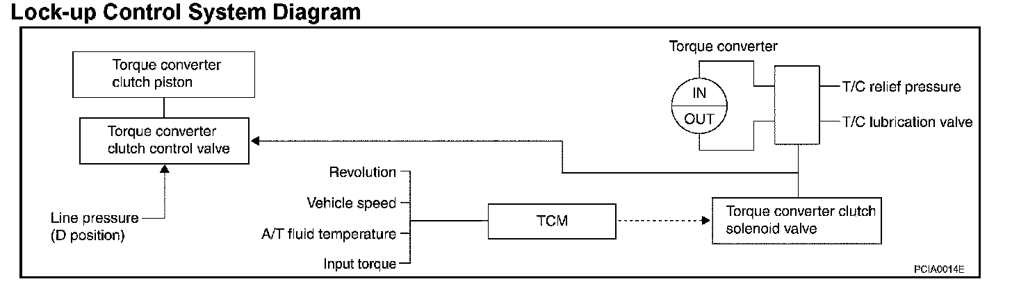 The torque converter clutch control valve operation is controlled by the torque converter clutch solenoid valve, which is controlled by a signal from TCM, and the torque converter clutch control valve engages or releases the torque converter clutch piston.