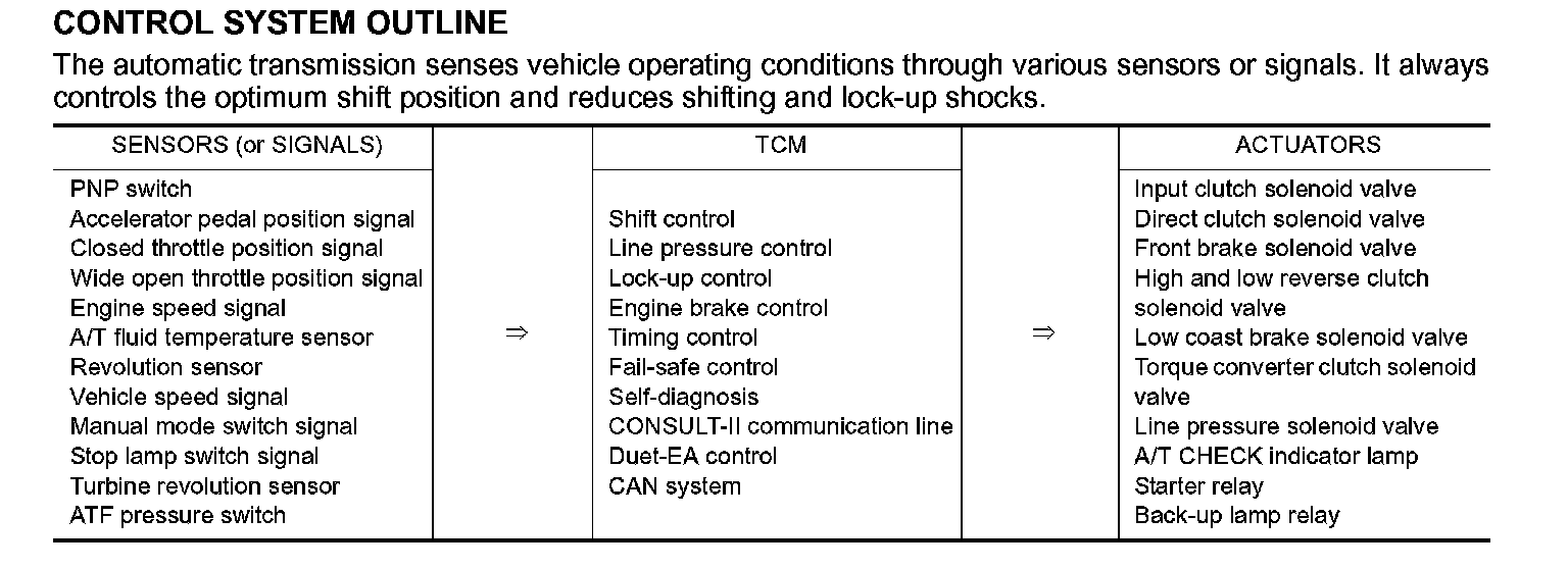 The automatic transmission senses vehicle operating conditions through various sensors or signals. It always controls the optimum shift position and reduces shifting and lock-up shocks.
