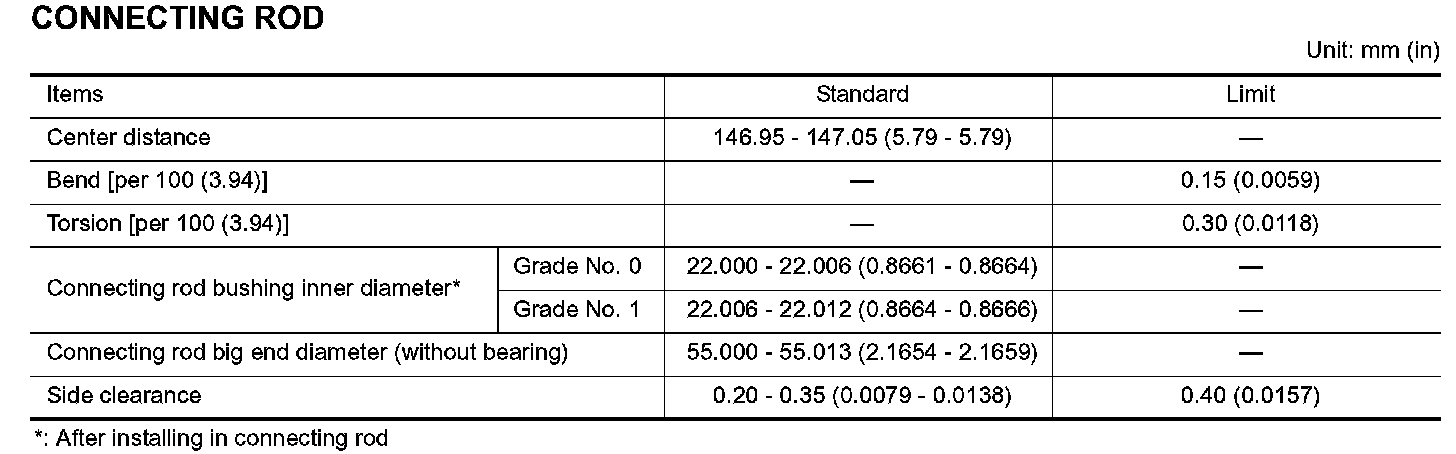 ^ If the measured value exceeds the limit, replace connecting rod, and measure again. If it still exceeds the limit, replace crankshaft also.