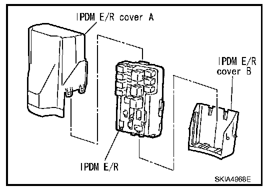 2. Remove IPDM E/R cover A. While pressing pawl on backside of IPDM E/R cover B toward vehicle front to unlock, lift up IPDM E/R.