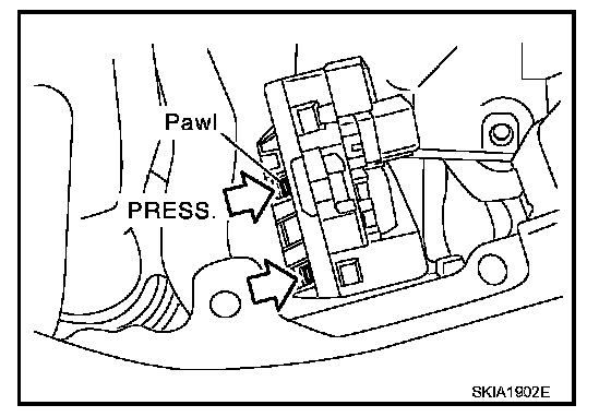 3. While pressing pawls on right and left side of IPDM E/R, remove IPDM E/R cover B from IPDM E/R.