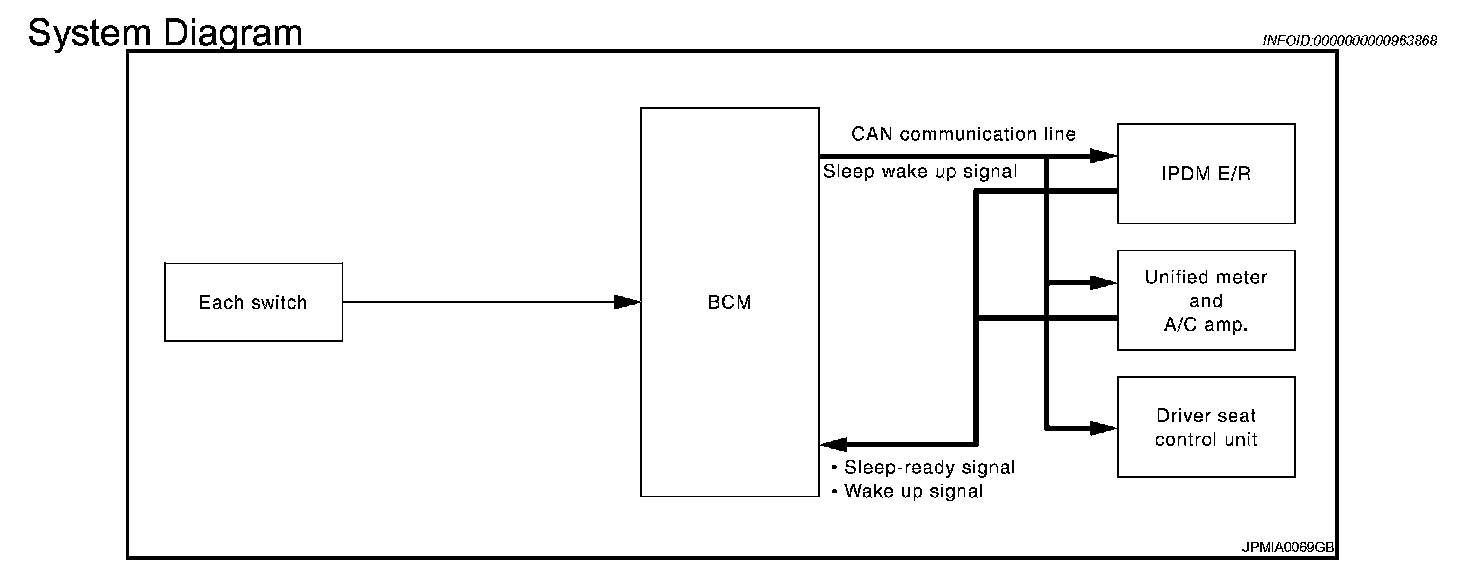 - BCM receives the sleep-ready signal (ready) from IPDM E/R and unified meter and A/C amp. via CAN communication.