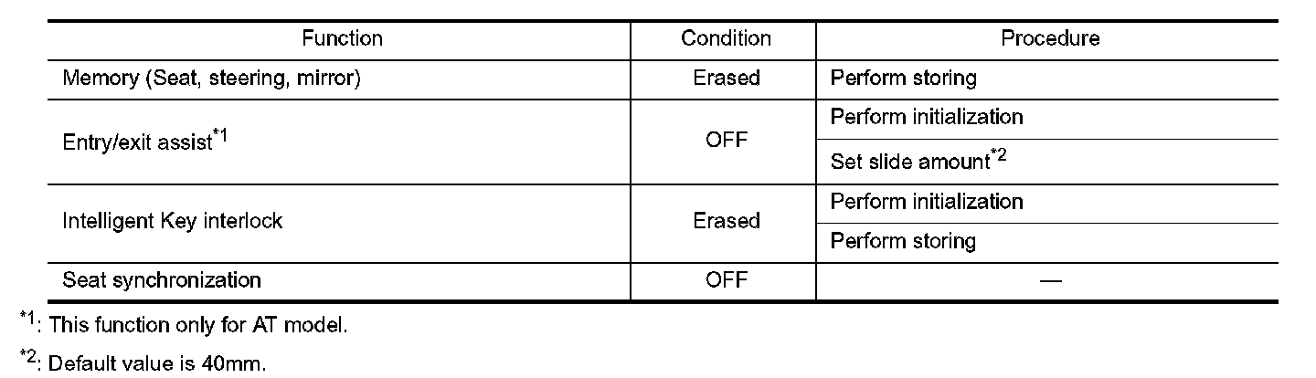 Each function is reset to the following condition when the battery terminal is disconnected.