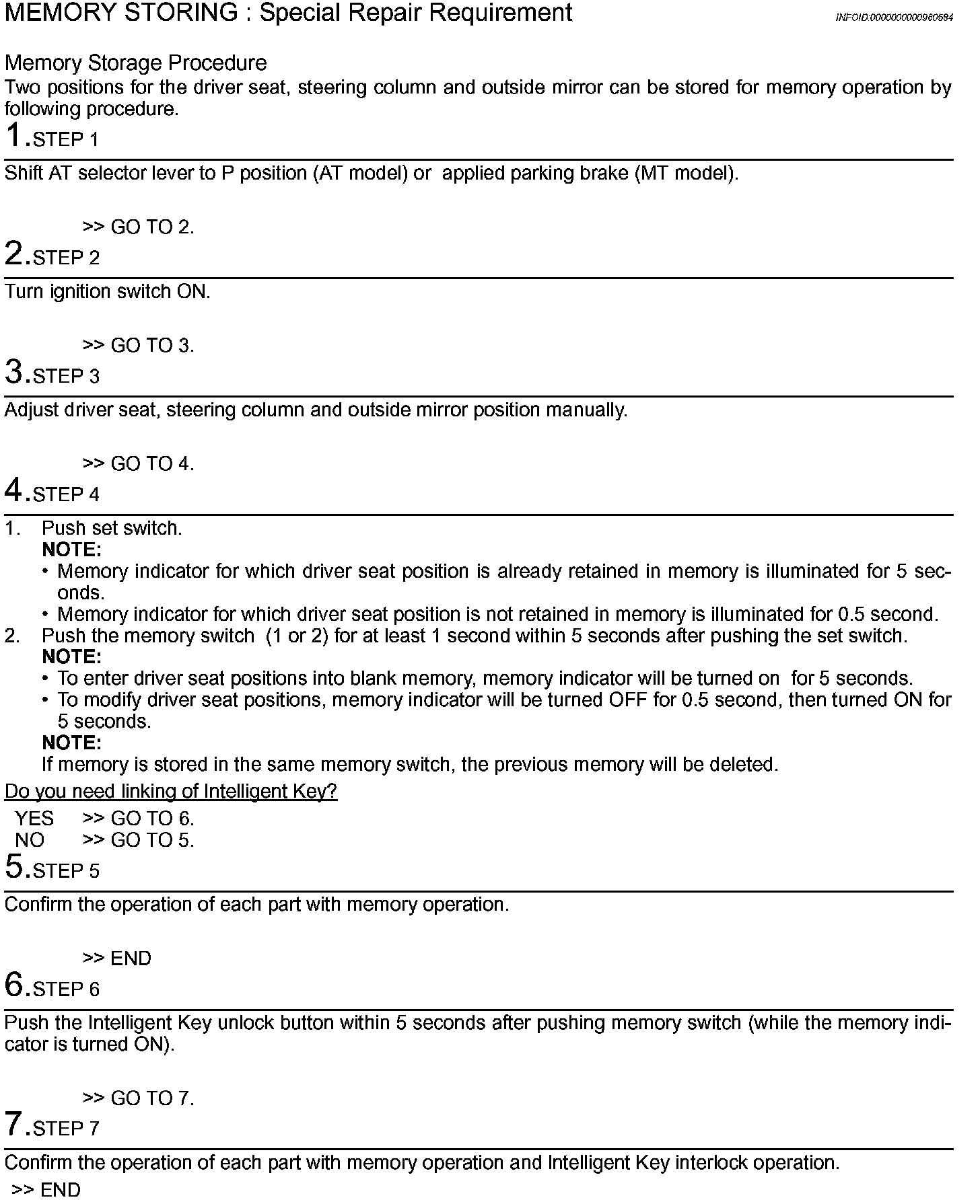 Always perform the memory storage when the battery terminal is disconnected or the driver seat control unit is replaced. The memory function and Intelligent Key interlock function will not operate normally if no memory storage is performed.