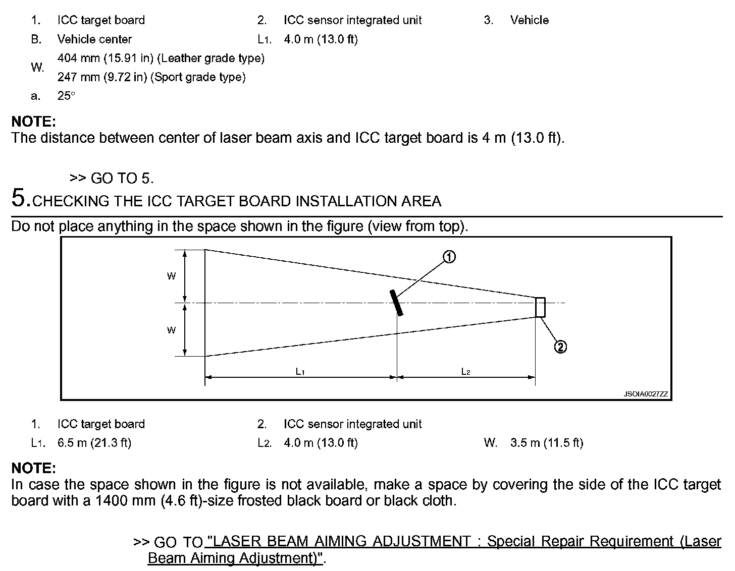 - Adjust laser beam aiming at a horizontal place as far as 12 m (39 ft) forward the vehicle can be seen.