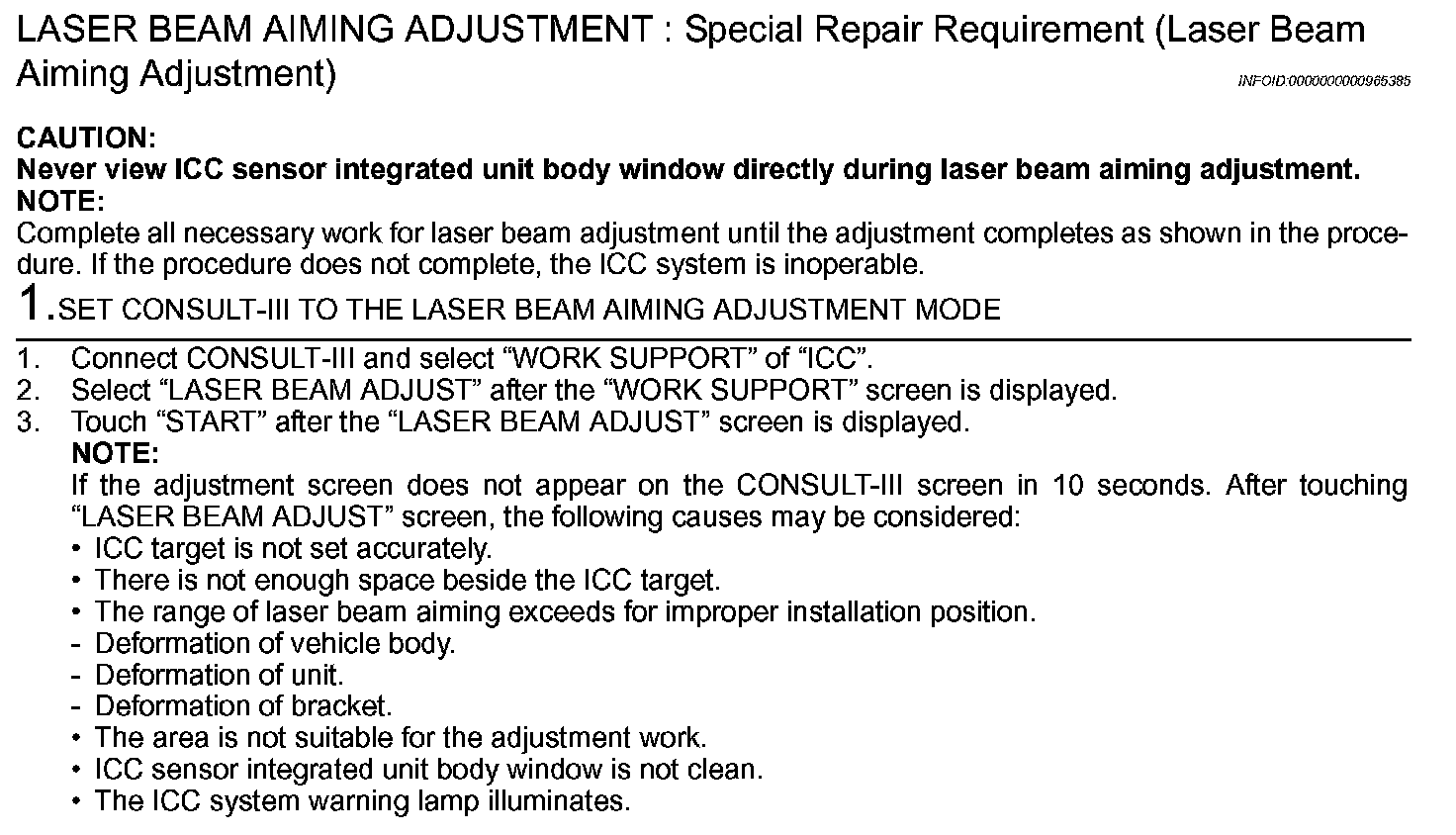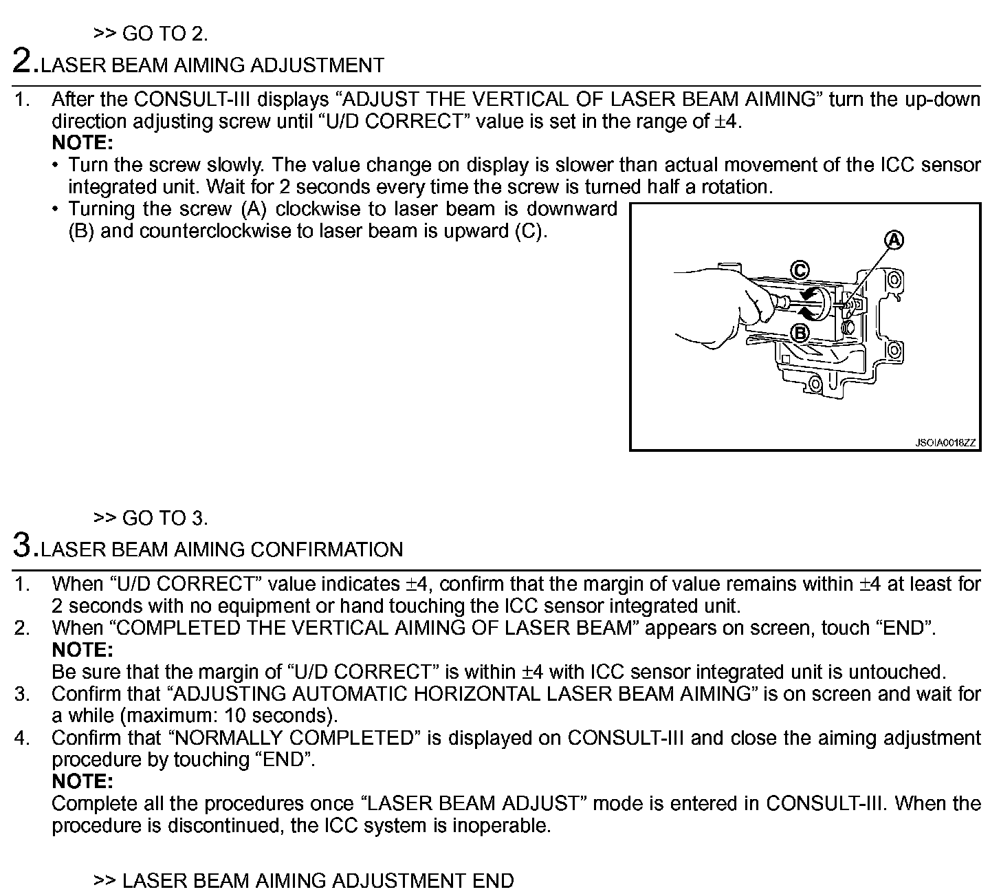 - Follow the CONSULT-III when adjusting the laser beam aiming (laser beam aiming adjustment cannot be operated without CONSULT-III).