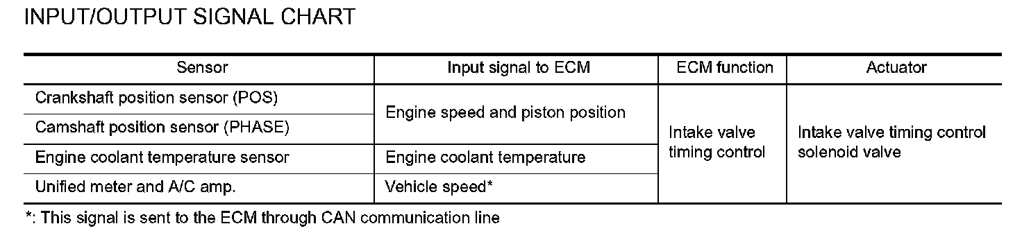 The ECM receives signals such as crankshaft position, camshaft position, engine speed, and engine coolant temperature. Then, the ECM sends ON/OFF pulse duty signals to the intake valve timing (IVT) control solenoid valve depending on driving status. This makes it possible to control the shut/open timing of the intake valve to increase engine torque in low/mid speed range and output in high-speed range.