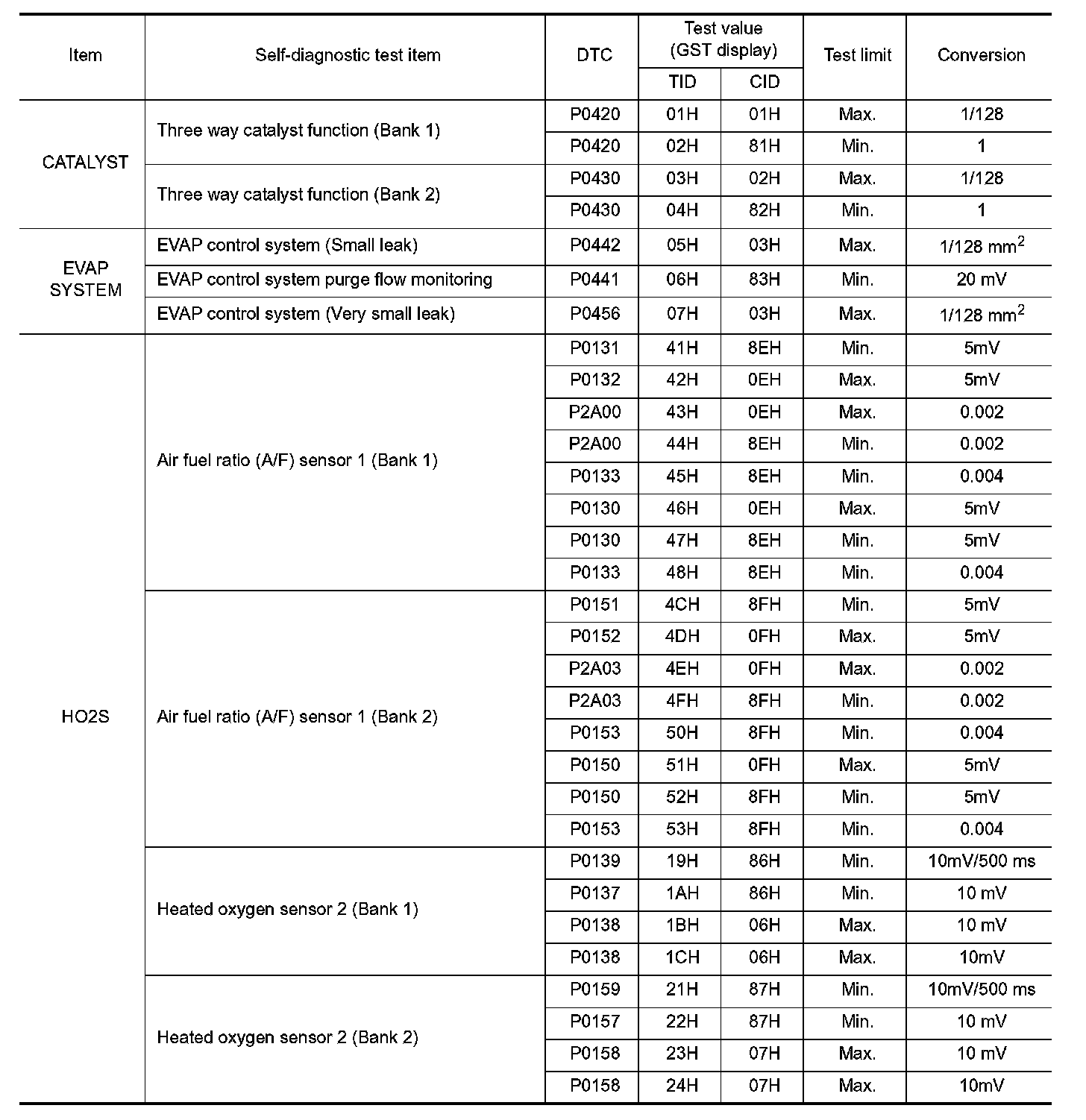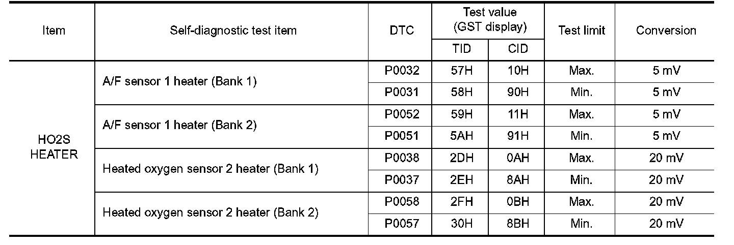 The test value is a parameter used to determine whether a system/circuit diagnostic test is OK or NO while being monitored by the ECM during self-diagnosis. The test limit is a reference value which is specified as the maximum or minimum value and is compared with the test value being monitored.