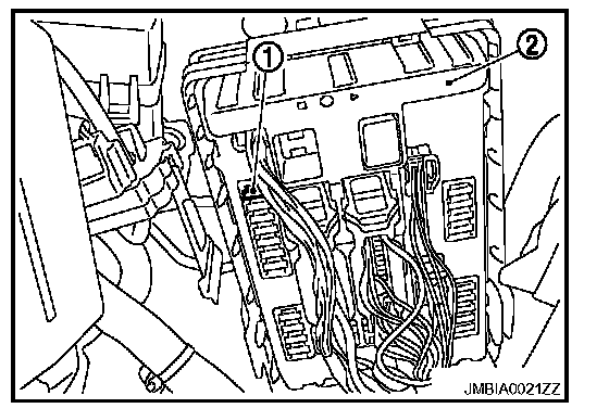 3. Disconnect fuel pump fuse (1) from IPDM E/R (2) to avoid fuel injection during measurement.