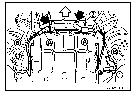 11. Engage terminal cord assembly and A/T fluid temperature sensor 2 harness with terminal clips (<=).