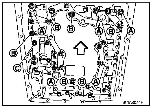 8. Install bolts A, B and C in control valve with TCM.