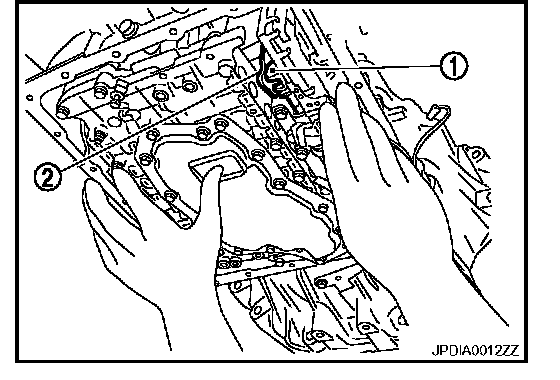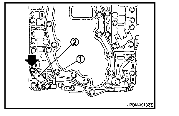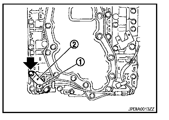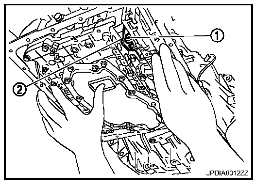 ^ Assemble it so that manual valve (1) cutout is engaged with manual plate (2) projection.