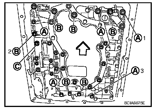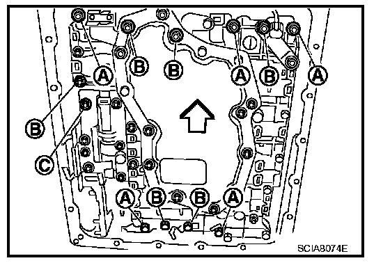 17. Remove bolts A, B and C from control valve with TCM.