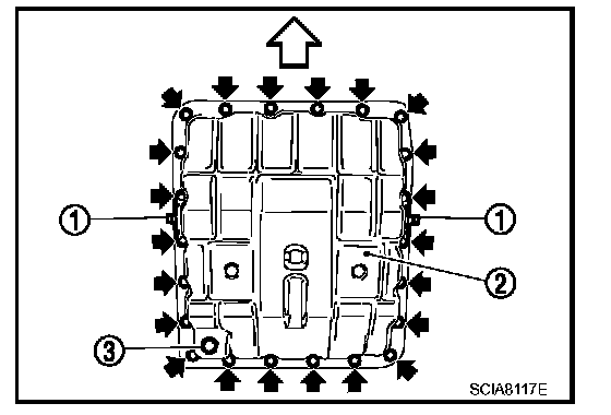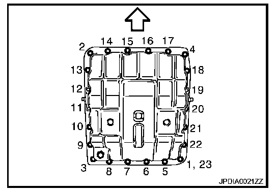 17. Tighten oil pan mounting bolts to the specified torque in numerical order shown in the figure after temporarily tightening them. Tighten oil pan mounting bolts to the specified torque.