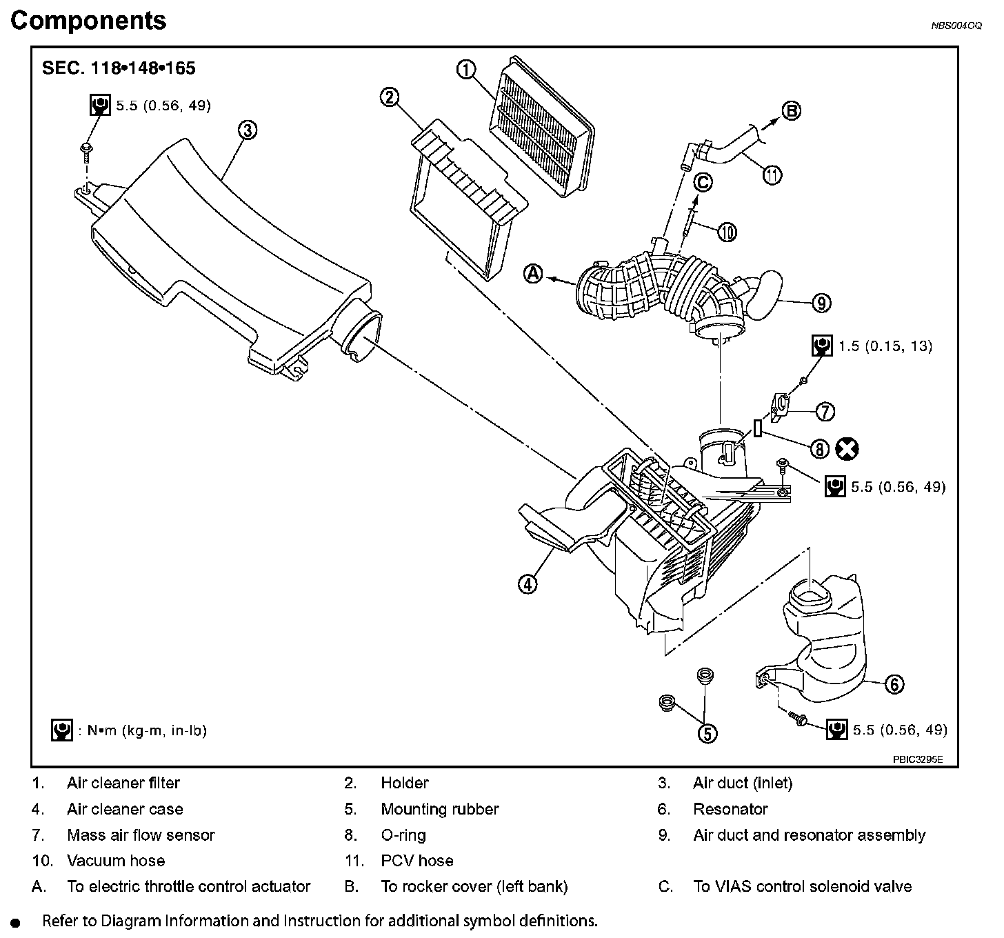 4. Remove air duct (inlet), air cleaner case and mass air flow sensor assembly, air duct and resonator assembly disconnecting their joints.
