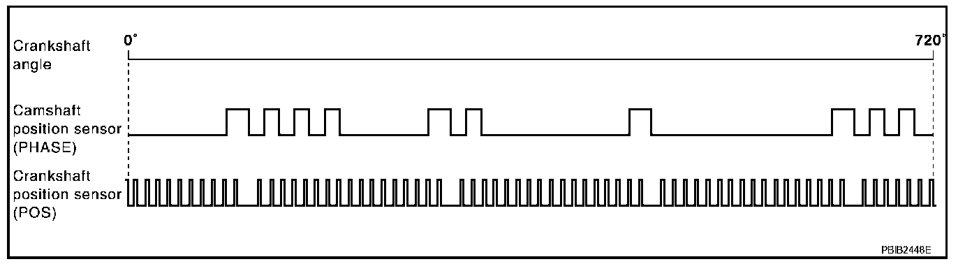 The crankshaft position sensor (POS) is located on the A/T converter housing facing the gear teeth (cogs) of the signal plate. It detects the fluctuation of the engine revolution.