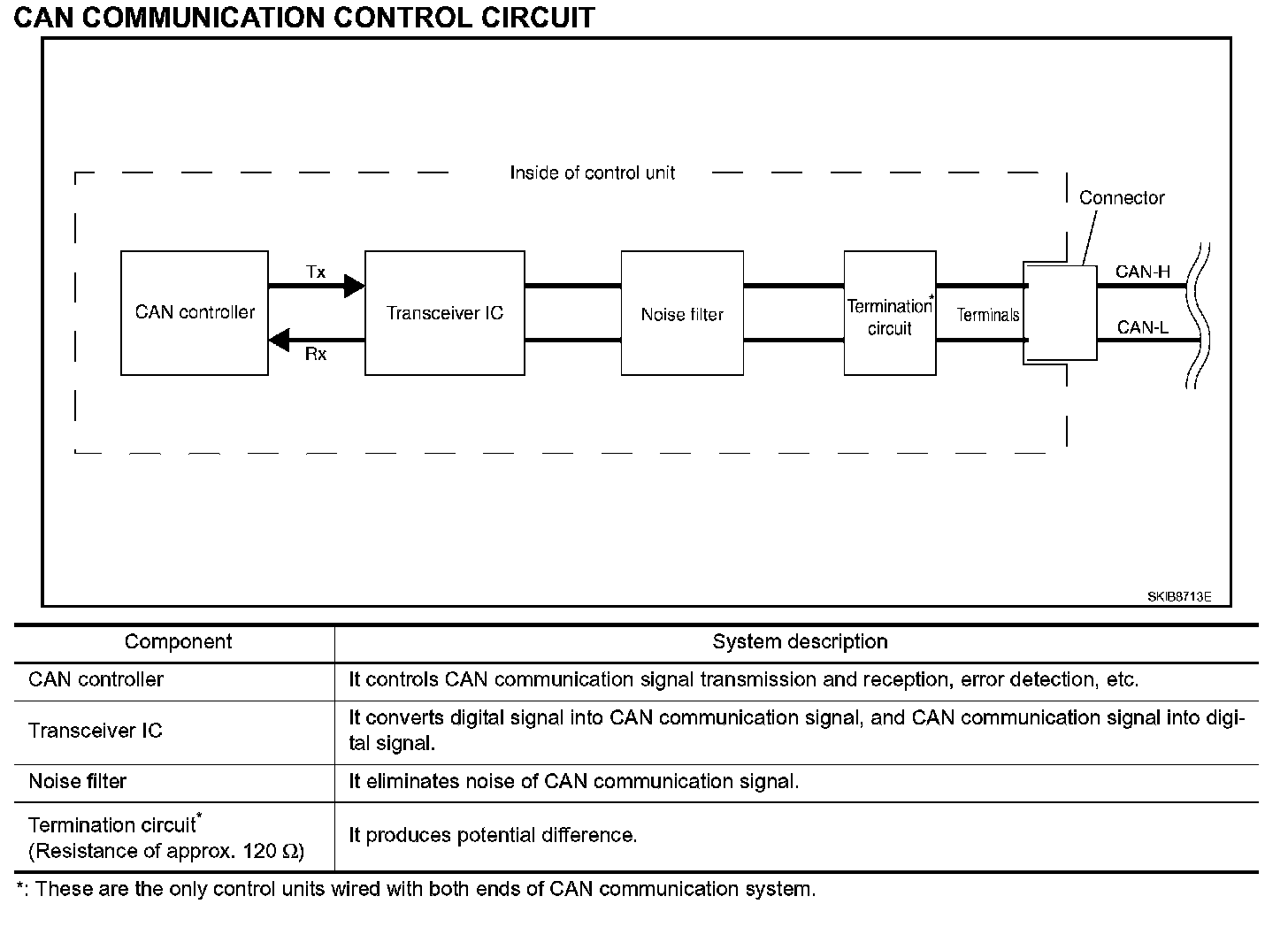 Each control unit passes an electric current to the termination circuits when transmitting CAN communication signal. The termination circuits produce an electrical potential difference between CAN-H and CAN-L. CAN communication system transmits and receives CAN communication signals by the potential difference.