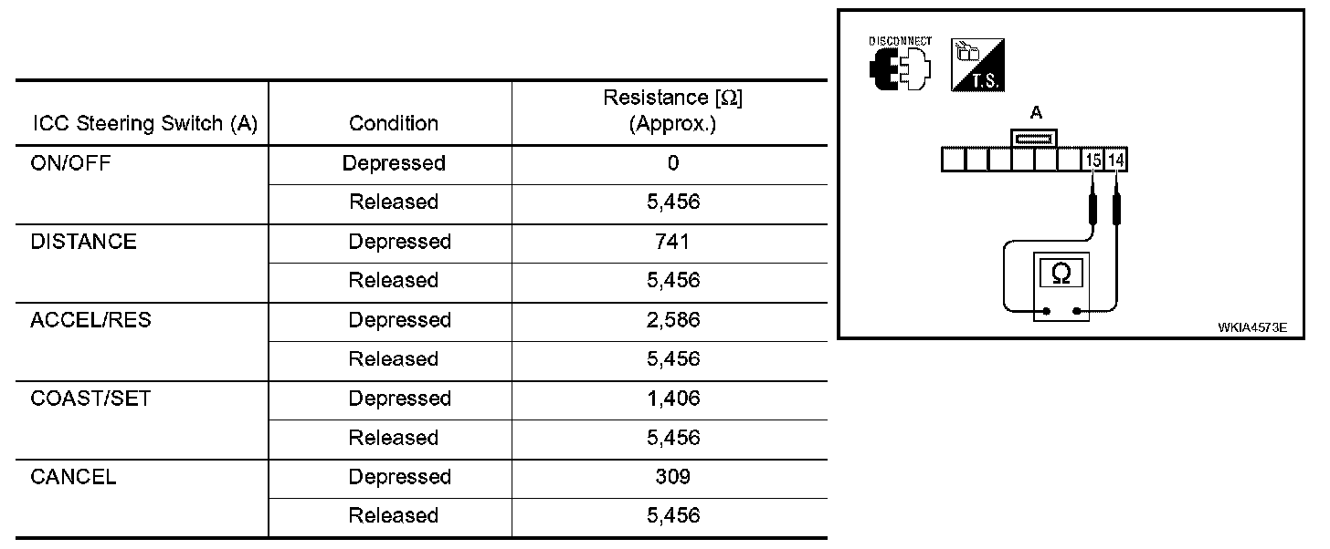 Check resistance between terminals 14 and 15 while depressing each switch.