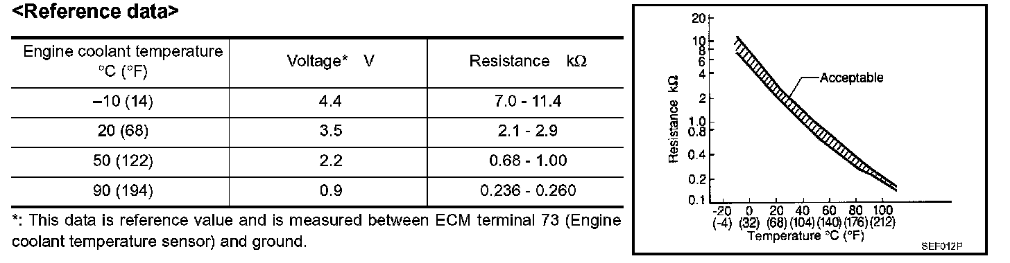 The engine coolant temperature sensor is used to detect the engine coolant temperature. The sensor modifies a voltage signal from the ECM. The modified signal returns to the ECM as the engine coolant temperature input. The sensor uses a thermistor which is sensitive to the change in temperature. The electrical resistance of the thermistor decreases as temperature increases.